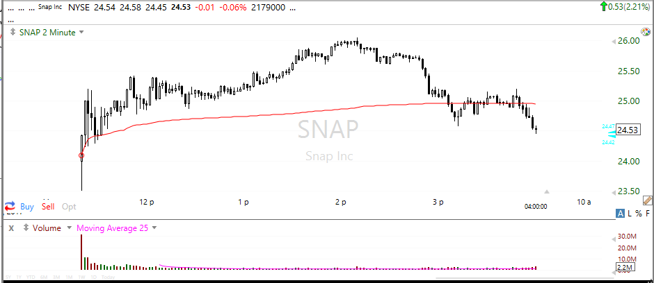 上は、スナップの2分足チャート、そして入れた赤い線はVWAP(出来高加重平均)です。大引けまで、まだ60分残っていますが、今のところ初日取引は大成功です。