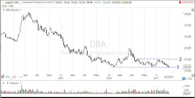 上は、トウモロコシや小麦などの農産物に投資しているETF、PowerShares DB Agriculture (DBA)の週足チャートです。見てのとおり低迷が続き、投資家たちから明らかに嫌われています。