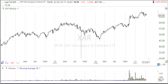 下は、軍事関連のETF、SPDR S&P Aerospace & Defense (XAR)の週足チャートです。